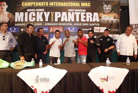 Como parte de un paquete de cuatro eventos que se van a llevar a cabo en Juárez, en el marco de las acciones que ha emprendido la actual administración para impulsar el deporte y la presentación de eventos de calidad en diferentes disciplinas, esta tarde fue presentada oficialmente la pelea entre Micky Román y Nery “Pantera” Saguilán, que se llevará a cabo el próximo sábado 24 de julio en el Gimnasio Josué Nery Santos.