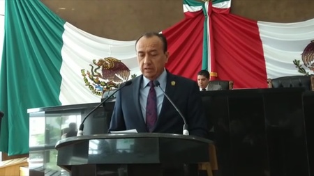 Maynez Cano uso la tribuna del Congreso del Estado para defender la permanencia del grupo parlamentario del PES con Periódico Oficial del Estado en mano y el Ley de Partidos Políticos para denunciar que se pretende reducir la capacidad política del Congreso.