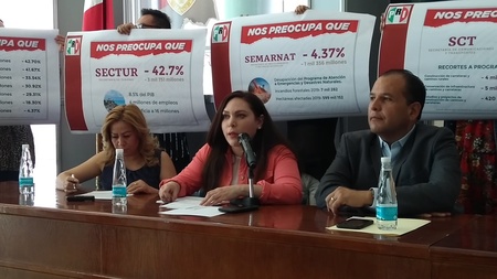 El dirigente estatal del PRI, Omar Bazán Flores, acompañado de las legisladoras Rosa Isela Gaytán, Marisela Sáenz y Georgina Zapata, expresaron su preocupación por la disminución en el presupuesto en la SCT, Sader y otros programas sociales.