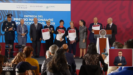El Gobierno también otorgó dos menciones honoríficas al grupo de científicos responsables por el monitoreo de la actividad del volcán Popocatépetl -integrado por María Aurora Armienta Hernández, Ana Lillian Martín del Pozo, Hugo Delgado Granados, Carlos Miguel González y Servando de la Cruz- y a la Secretaría de Marina.