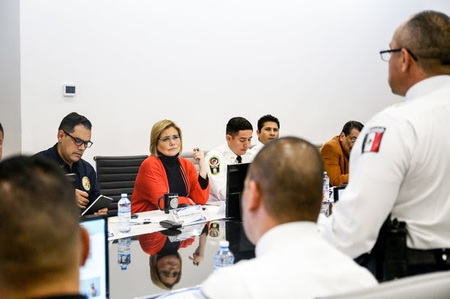 La Presidenta municipal, Maru Campos Galván encabezó este viernes la reunión mensual de áreas de la Dirección de Seguridad Pública Municipal, llevada a cabo en las instalaciones de la Comandancia Norte, donde además se realizó una evaluación del trabajo efectuado durante el último mes, para revisar los resultados en materia de seguridad por zonas.