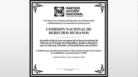 La expresión está acompañada de una esquela que dice: "A 29 años de su creación, participamos con profundo dolor el fallecimiento de la autonomía de nuestra joven Comisión Nacional de Derechos Humanos, acaecida el día de ayer en manos de la fuerza irracional de Morena en el Senado de la República, donde se demostró una vez más que el fraude y el autoritarismo son su divisa".
