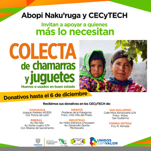 El Colegio de Estudios Científicos y Tecnológicos del Estado de Chihuahua (Cecytech) en alianza con la asociación civil Abopi Naku’ruga invitan a participar en la colecta de chamarras y juguetes que se llevarán a comunidades de pueblos originarios en la Sierra Tarahumara.