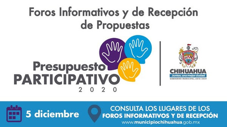 El Gobierno Municipal de Chihuahua, a través de la Dirección de Planeación y Evaluación invita a los foros informativos para la realización del Presupuesto Participativo 2020 que se realizarán el próximo jueves 5 de diciembre.