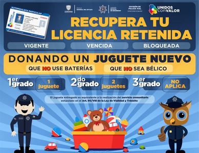 La Comisión Estatal de Seguridad a través del Departamento de Oficiales Calificadores de la División de Policía Vial, invita a todos los conductores que tengan retenida la licencia por la falta de realización de algún servicio comunitario, a donar un juguete a cambio de la liberación del documento.