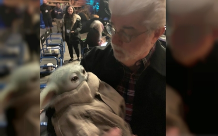 El creador del Universo de Star Wars fue invitado por Jon Favreau, quien se desempeña como guionista, inventor y showrunner de la serie, y al estar en el set de grabación tomó entre sus brazos a Baby Yoda.