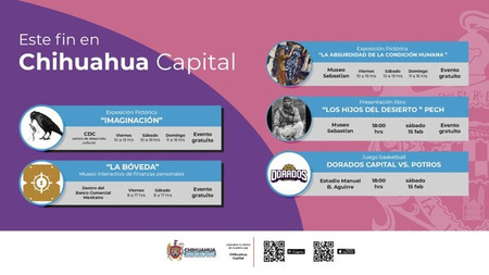 Chihuahua Capital tiene varias opciones para que disfrutes este fin de semana con tus seres queridos, amigos o conocidos. El Gobierno Municipal, a través del Instituto de Cultura del Municipio, el Instituto de Cultura Física y Deporte y la Dirección de Desarrollo Económico y Turístico, pone a tu alcance diversos eventos y exposiciones. Aquí te los compartimos: