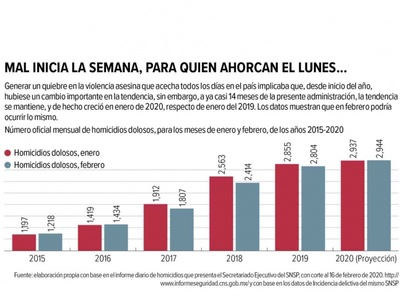 El 20 de febrero se darán a conocer los datos preliminares de homicidios para el mes de enero. Mientras tanto, el conteo diario preliminar es de dos mil 376 homicidios dolosos, cifra superior a la registrada en enero del 2019, cuando se registraron dos mil 325 casos. Si embargo, en la cifra definitiva mensual, el dato creció a dos mil 885 víctimas, es decir, 24.08% más.