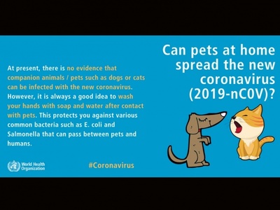 "En la actualidad, no hay evidencia de que los animales de compañía / mascotas, como perros o gatos, puedan infectarse con el nuevo coronavirus. Sin embargo, siempre es una buena idea lavarse las manos con agua y jabón después del contacto con las mascotas. Esto lo protege contra varias bacterias comunes como E. coli y Salmonella que pueden pasar entre mascotas y humanos".