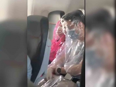 Una pareja fue grabada mientras viajaba en un avión con todo el cuerpo envuelto en plástico por temor al coronavirus Covid-19.