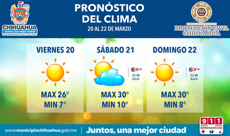 El Gobierno Municipal, a través de la Coordinación Municipal de Protección Civil, informa a la ciudadanía sobre el pronóstico meteorológico para este fin de semana en el municipio de Chihuahua, a fin de que se tomen las previsiones correspondientes ante la probabilidad de rachas de viento de 48 kilómetros por hora y temperaturas cálidas de 30 grados centígrados.