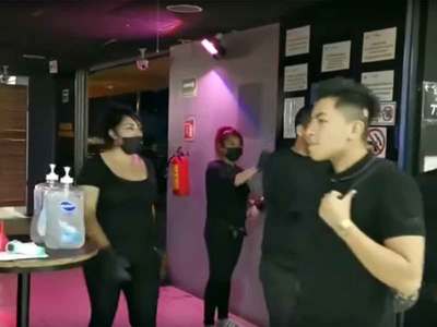 Empleados del bar que portan cubrebocas y guantes reciben en la entrada a los clientes a quienes les toman la temperatura, les colocan un poco de gel antibacterial y sin más ingresan al establecimiento.