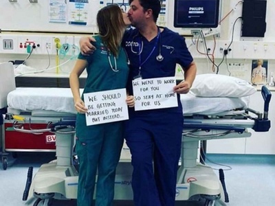 Aunque no hubo celebración, los enamorados no se quedaron con las ganas de vestirse de blanco y sus colegas les improvisaron un 'traje' y un 'vestido' y se retrataron frente a una ambulancia.