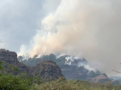 El combate al incendio en el cerro El Tepozteco en Tepoztlán, Morelos, continúa por tercer día con el apoyo de un helicóptero de la Guardia Nacional.