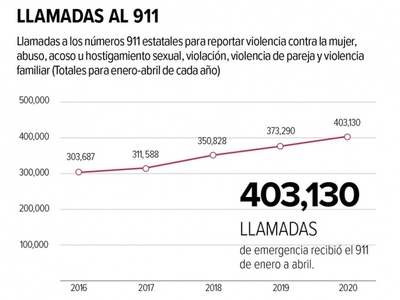 Así, el incremento en estas llamadas hechas por las mexicanas ha sido escalonado en los últimos años, pues las 403 mil peticiones de auxilio que sumaron al primer cuatrimestre de este 2020 son 15% superiores a las registradas en el mismo periodo de 2018 (cuando se recibieron 350 mil 828 llamadas), 30% más que las de 2017 (311 mil 588) y 33% más que en 2016 (303 mil 687).