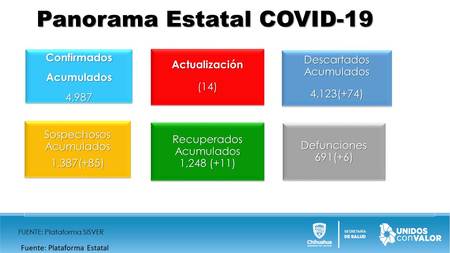 El director médico de la Secretaría de Salud en la Zona Norte, Arturo Valenzuela Zorrilla, informó que se agregaron 87 nuevos registros a los contagios de COVID-19 para sumar 4 mil 987 en el estado, mientras que las defunciones llegaron a 691 con 6 nuevos casos.