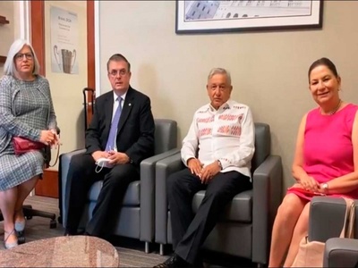 Acompañado por el secretario de Relaciones Exteriores, Marcelo Ebrard; la embajadora de México en Washington, Martha Bárcena; y la secretaria de Economía, Graciela Márquez, el titular del Ejecutivo federal se alista para su regreso a México.