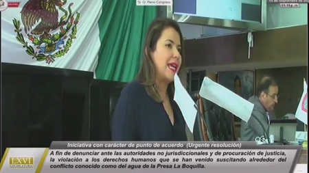 La diputada local del Pan Georgina Bujanda, presentó una iniciativa de urgente resolución a efecto de denunciar ante las autoridades no jurisdiccionales y de procuración de justicia las violaciones graves que a los derechos humanos que han ido sucintándose al tenor de la problemática del agua en la presa la boquillas.