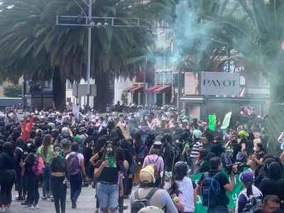 Las manifestantes -en su mayoría con los rostros cubiertos y vestidas en color negro- portan martillos, bates y algunos extintores con los que han rociado a las policías que resguardan la manifestación.