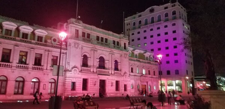 Como cada año, este 19 de octubre se conmemora la lucha contra el cáncer de mama, por lo que personal de la Subdirección de Alumbrado Público realizó las adecuaciones necesarias para iluminar de rosa los edificios que se encuentran en la concurrida plaza.