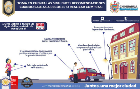 Debido a las compras que se incrementan en esta temporada y con el objetivo de prevenir daños en cristales o chapas de autos estacionados para sustraer objetos de su interior, el Gobierno Municipal, a través de la Dirección de Seguridad Pública Municipal, recomienda a la población en general evitar poner dentro del auto y a la vista, cosas valiosas que llamen la atención de delincuentes, tales como bolsos, celulares, computadoras, chamarras, artículos recién adquiridos, entre otros, como medida de autocuidado.