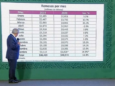 El presidente Andrés Manuel López Obrador informó que de acuerdo a estimados, se alcanzó un récord de envíos de dinero al país, con lo que se superó la cifra de los 40 mil millones de dólares.