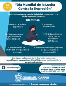 El Gobierno Municipal a través del Centro de Atención y Prevención Psicológicas (CAPPSI), se une a la conmemoración del “Dia Mundial de la Lucha Contra la Depresión” que se celebra cada 13 de enero, con acciones de atención y prevención para atender este trastorno.