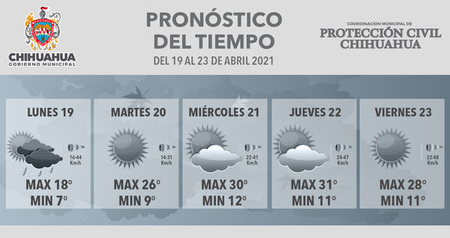 Para este lunes se prevé que sea el día más fresco con una temperatura máxima de 18 grados y una mínima de 7, con probable presencia de lluvias por la tarde; el martes se espera que la máxima sea de 26 grados Celsius y la mínima de 9; miércoles y jueves el termómetro subirá a los 30 y 31 grados y bajará a los 12 y 11 grados, respectivamente; en tanto el viernes será una jornada mayormente soleada, con temperatura máxima de 28 grados centígrados y mínima de 11° C.