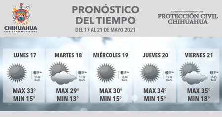 Este lunes la temperatura máxima esperada será de 33 grados Celsius y la mínima de 15; para el martes se esperan nublados y el termómetro llegará a los 29 grados y descenderá a los 13°; para el miércoles y jueves las temperaturas máximas oscilarán entre los 30 y 34 grados, respectivamente y las mínimas se mantendrán igual para ambos días, con 15 grados Celsius; el viernes se esperan nubosidades con temperatura máxima de 35 grados y mínima de 18° C.