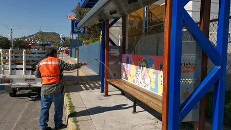 El Gobierno Municipal, a través de la Dirección de Mantenimiento Urbano, trabaja de forma permanente en la desinfección de parabuses ubicados en distintos puntos de la ciudad con el propósito de disminuir el riesgo de contagios por COVID.