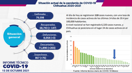 El Gobierno del Estado, a través de la Secretaría de Salud de Chihuahua, presenta este 15 de octubre el reporte COVID-19, en el cual se registran 79 mil, 598 (+110) personas confirmadas en la entidad por este padecimiento, 68 mil 743 (+147) casos recuperados, 71 mil 890 (+203) descartados y 867 (+76) casos sospechosos.