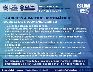 En el municipio de Chihuahua no existen reportes de asaltos a usuarios de cajeros automáticos, sin embargo, el Gobierno Municipal a través de la Dirección de Seguridad Pública Municipal, emite una serie de recomendaciones para evitar convertirse en víctima de quien busca el dinero fácil.