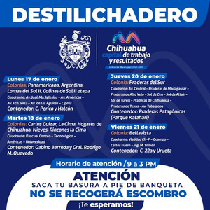 Con el objetivo de evitar que la basura de grandes dimensiones termine en arroyos o las calles de la ciudad, el Gobierno Municipal, a través de la Dirección de Servicios Públicos Municipales, llevará el programa de Destilichadero a 11 colonias del 17 al 21 de enero.