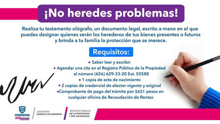 A través de la edición 2022 del programa Septiembre, Mes del Testamento, el Registro Público de la Propiedad en Ciudad Juárez, ha recibido hasta este momento 480 citas para la inscripción de testamentos ológrafos, cifra que representa un aumento de 68 por ciento con relación al mismo mes del 2021.