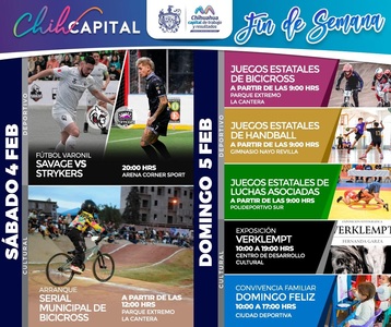 El Gobierno Municipal de Chihuahua, invita a toda la ciudadanía a disfrutar los eventos deportivos y culturales que se realizarán durante este fin de semana, con el objetivo de crear una sana convivencia familiar y social.